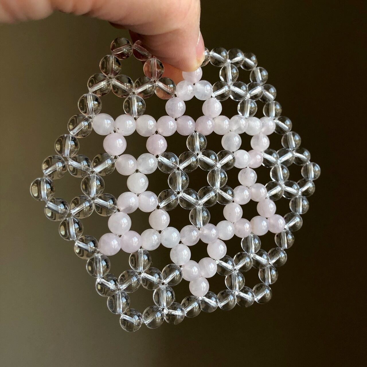 天然水晶をテグスで丁寧に編み込み六角形のかたちにデザインしたクリスタルマット。
